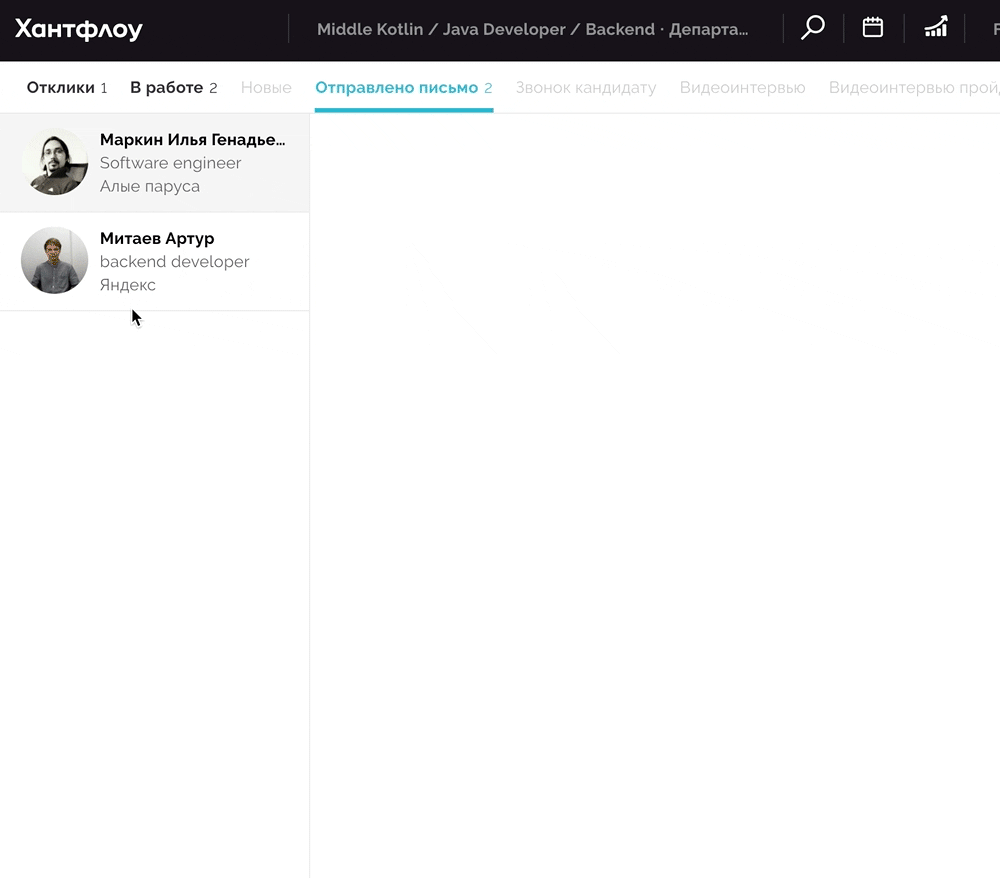 При переводе кандидата на другой этап Хантфлоу позволяет сразу же: