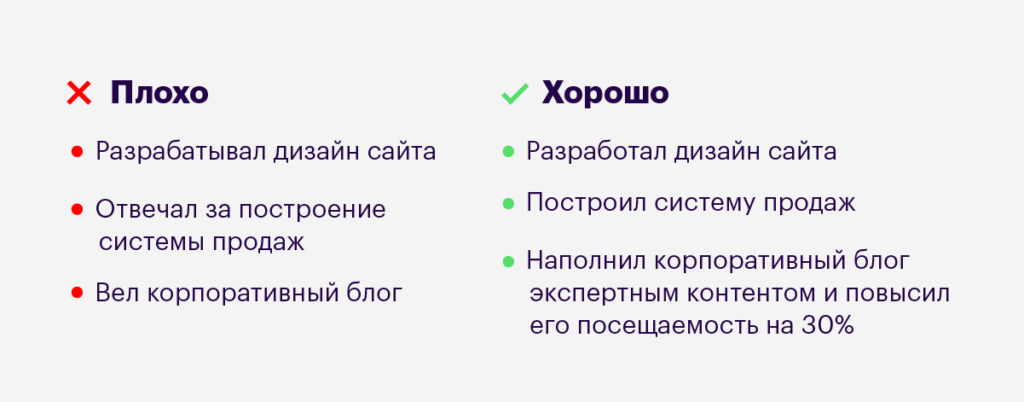 Обращайте внимание на глаголы в резюме. Хорошо, если они совершенного вида, то есть обозначают законченное действие: это демонстрирует ориентацию на результат, а не на процесс.