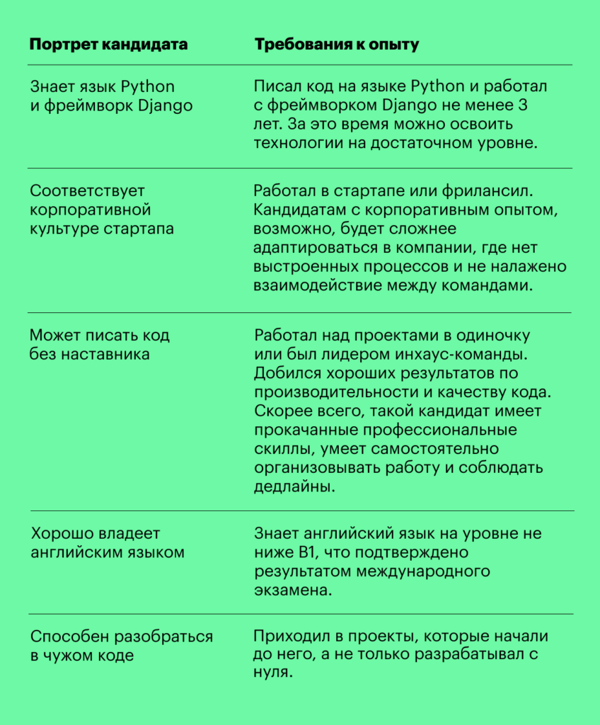 Допустим, стартапу требуется backend-разработчик, который будет поддерживать и улучшать сервис доставки посылок из-за границы. Опишем портрет идеального кандидата, а затем сформируем набор требований к опыту: