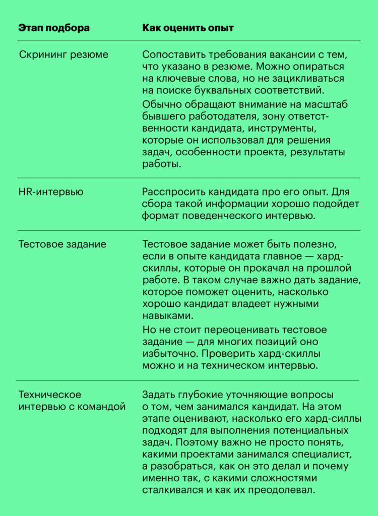 3. Критерии релевантности опыта для каждой позиции разные. Они зависят от бизнес-задач, зоны ответственности специалиста, ожидаемого уровня его самостоятельности и продуктивности.
