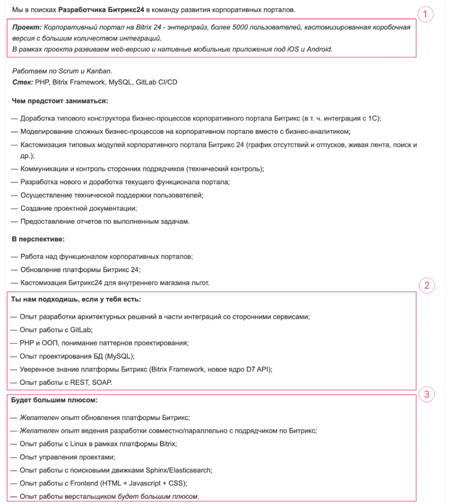 Допустим, компания ищет разработчика Битрикс24. Посмотрим на описание вакансии: