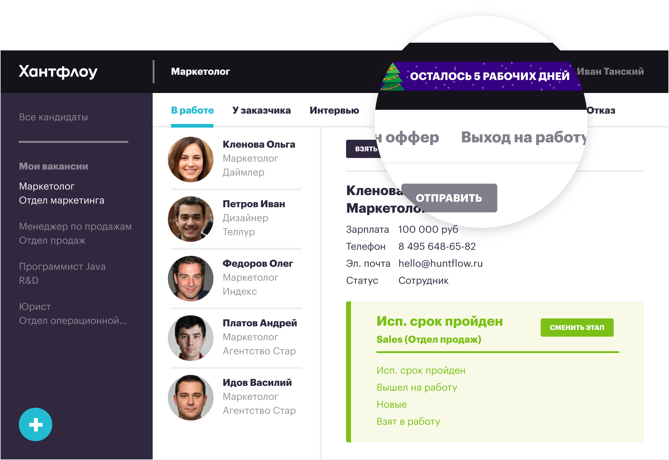 Хантфлоу — профессиональная программа для рекрутинга, которая помогает освободить время рекрутера, систематизировать процесс подбора и автоматизирует формирование отчетности