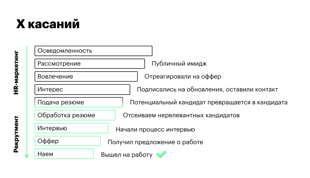 Задача этих этапов — познакомить кандидата с брендом компании и рассказать ему о корпоративной культуре. Важно сделать все для того, чтобы на одном из первых этапов классической воронки — первичном интервью — рекрутер общался уже с «теплым» и релевантным кандидатом, а конверсия была как можно выше.