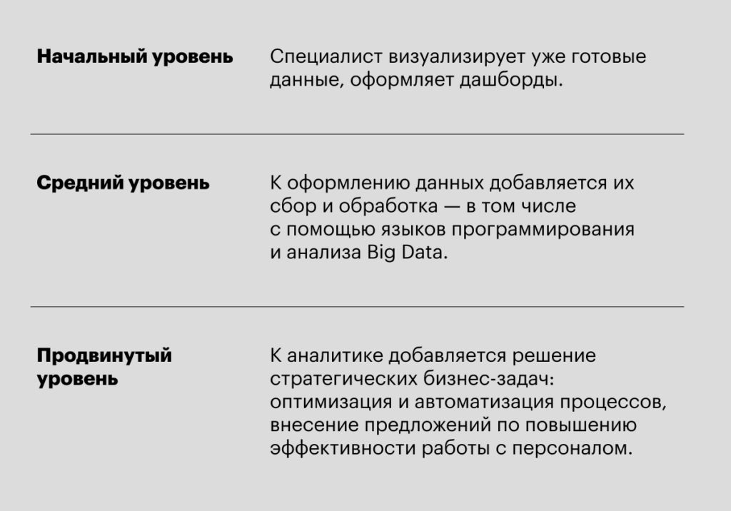 Поскольку профессия HR-аналитика в России еще достаточно молода, на рынке пока нет достаточного количества специалистов, чтобы сформировать сетку грейдов. Однако, на мой взгляд, распределить специалистов по уровням экспертизы можно было бы следующим образом: