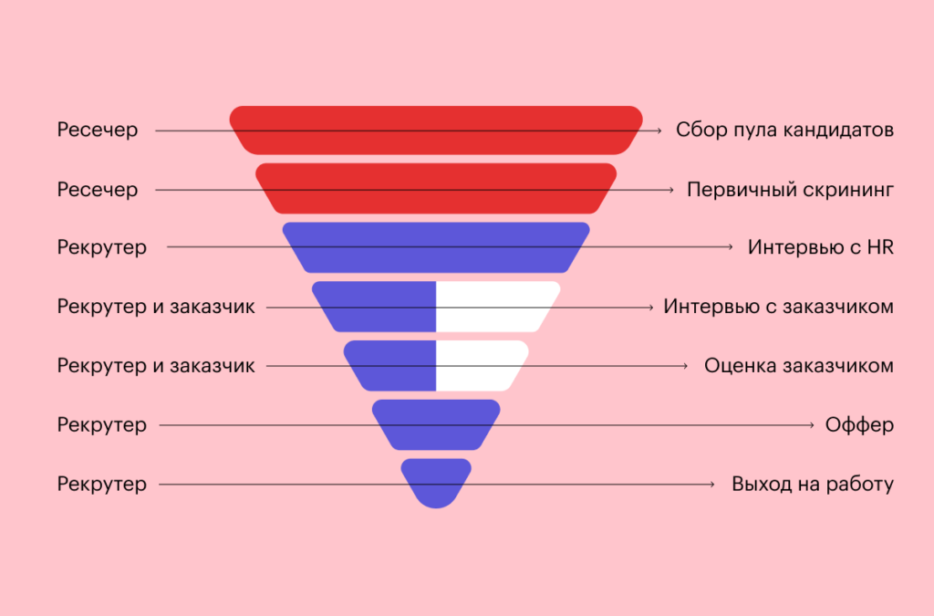 Ответственность за разные этапы воронки подбора. Ресечер работает с верхней частью воронки подбора, остальное берет на себя рекрутер.