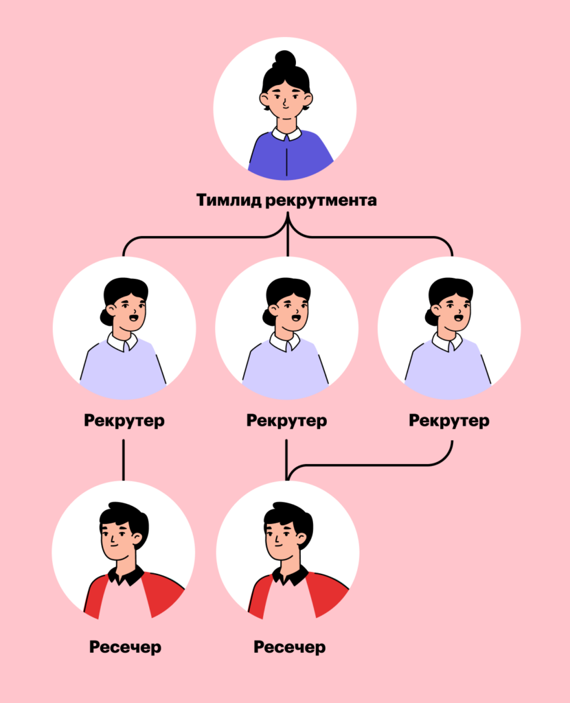 Вместе они работают как конвейер по подбору: ресечер ищет кандидатов, а рекрутер занимается оценкой, общением с нанимающим менеджером и наймом. Причем некоторые ресечеры так быстро справляются с поиском, что могут помогать сразу двум рекрутерам.