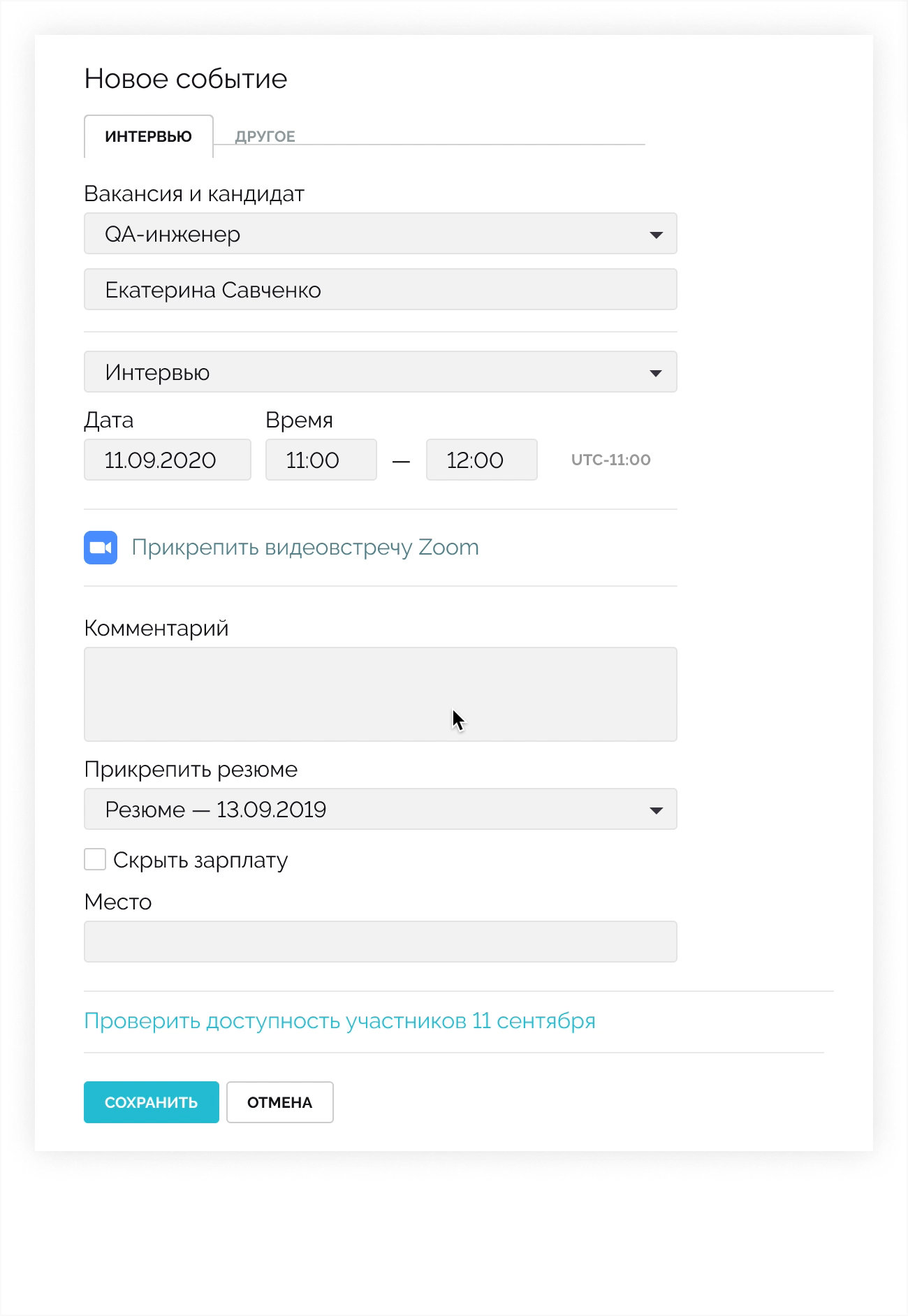 Видеоконференции в Zoom создаются автоматически. Вам достаточно нажать «Прикрепить видеовстречу Zoom» при создании нового события в календаре, а в его описании появится ссылка на видеовстречу и резюме кандидата.